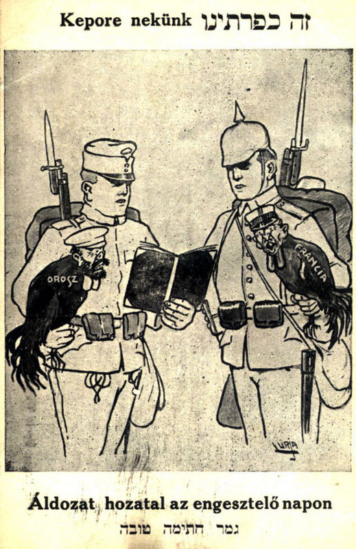 A kép tehát – ha jól értelmezzük – vélhetően arra utal, hogy a Monarchia hadserege úgy kíván elbánni az ellenséggel, miként a vallásos, hagyományőrző zsidók a fejük felett meglengetett kakasokkal… A valóság erre rácáfolt – de erről a kapara szertartás tehet legkevésbé.