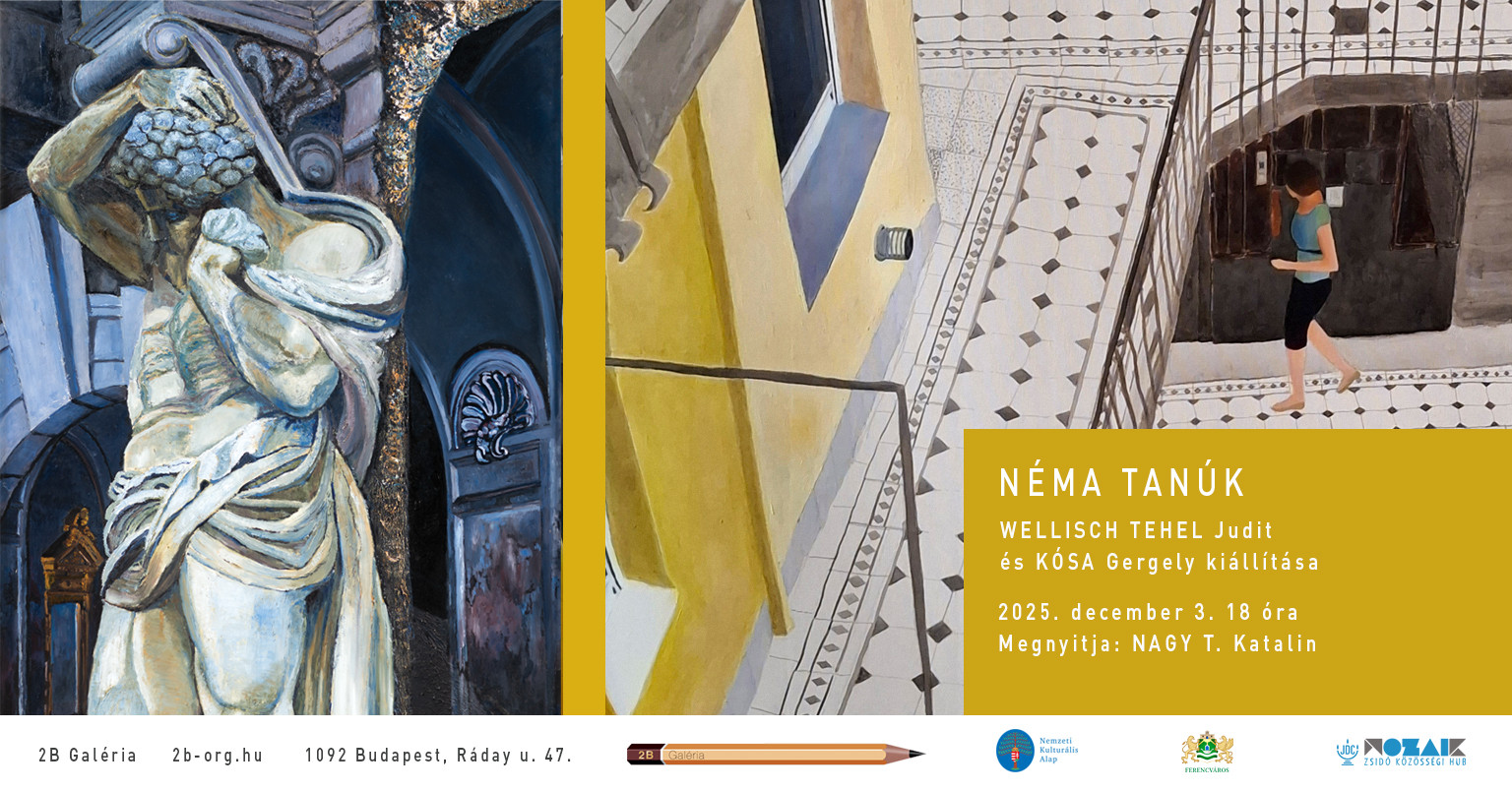Wellisch Tehel Judit és Kósa Gergely közös kiállítása Néma tanúk címmel nyílik meg december 3-án, szerdán este 6 órától, a tárlatot Nagy T. Katalin nyitja meg. Helyszín: 2B Galéria (Budapest, Ráday utca 47. szám).